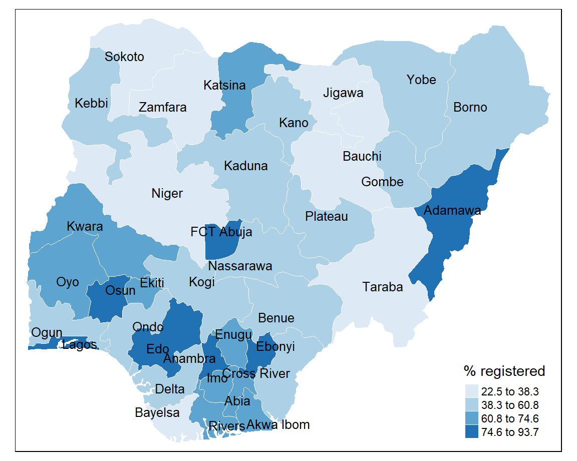 We have the boundaries of each state in Nigeria but we need some statistical data to create a choropleth map. We will be using data provided by the 2021 Nigeria Multiple Indicators Cluster Survey (MICS) on the percentage of children under age 5 whose births are registered by each Nigerian state.